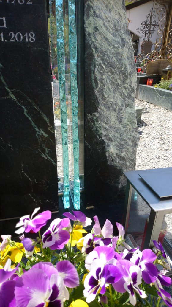 Mit einer geschmolzenen Grabtafel aus Glas können verschiedenste Farben für die Gestaltung verwendet werden. Dazu wird vor ab ein Entwurf dazu erstellt.