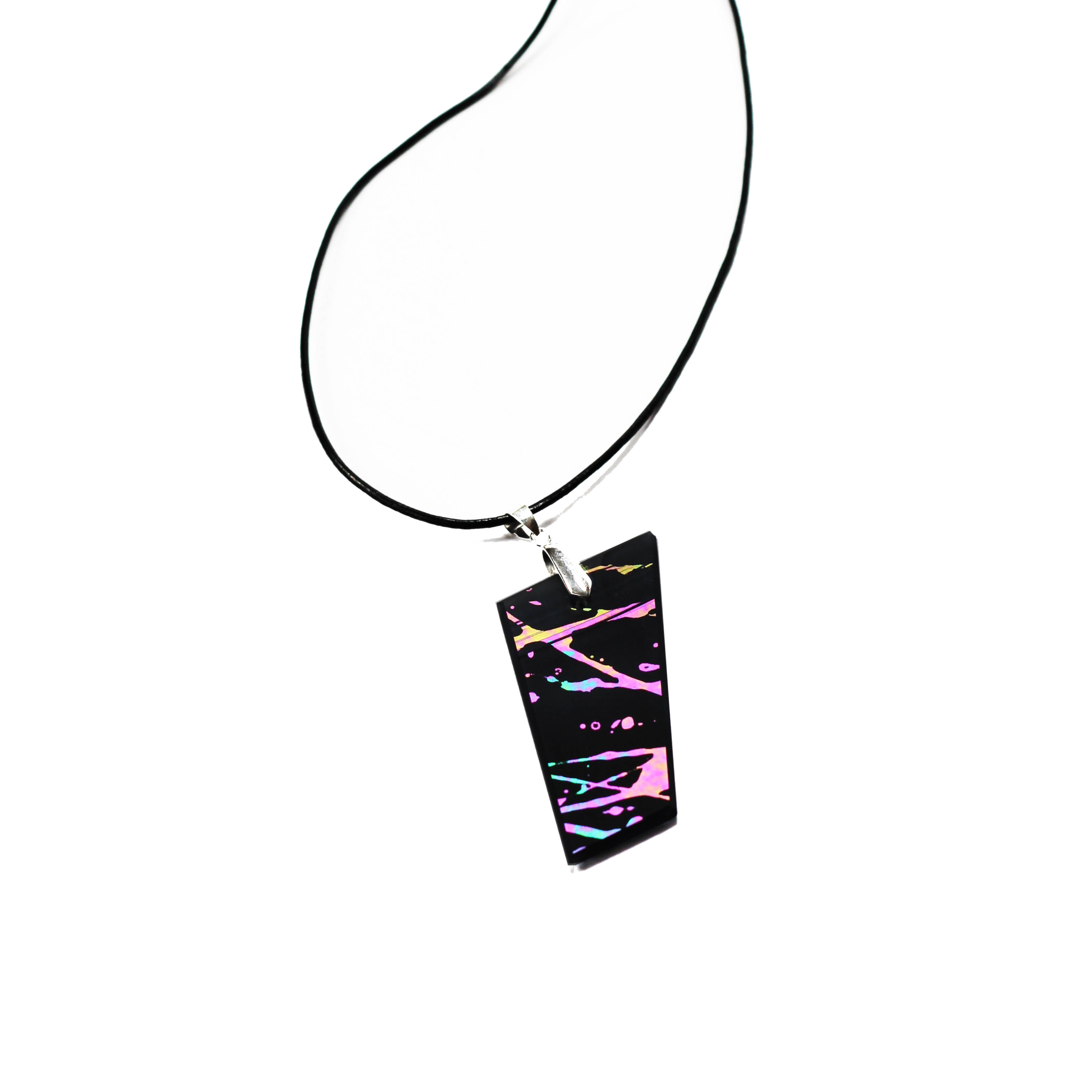 Der Glasanhänger ist mit einer silbernen Collierschlaufe an ein 2 mm starkes Lederband angehängt. Das Muster wird mit einer Sandstrahltecknik auf die Glasoberfläche gestrahlt. Die Größe und die Form des Anhängers kann leicht variieren.
